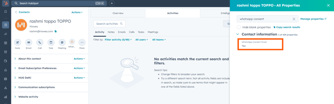 - Contact property "WhatsApp Consent Given" or your chosen property for capturing consent is set to "Yes"